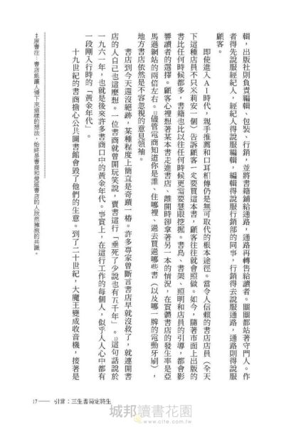 書店既是文學的遊樂場,也是一門賺錢的資本生意,有時前者更明顯,有時後者更重要,更多的時候似乎卡在兩者之間。就連明擺著想賺錢的書商,也常得假裝事實並非如此。有時,微薄的利潤反而成了值得驕傲的事。一九八八年的電影《愛在德蘭西》(Crossing Delancey)中,一位角色向「紐約最後一家真正的書店」舉杯致敬,感嘆這座城市已經被那些「乾淨、高得離譜、一心只想賺錢」的新型書店占領。做生意是冰冷的、錙銖必較的,書本則溫暖而無價。「書市」這個概念本身似乎天生就自相矛盾。一八二一年,美國第三任總統傑佛遜(Thomas Jefferson)寫信給繼任者麥迪遜(James Madison)時,稱書籍為「資本」,而非「純供消費」的產品。一百五十年過後,三生書局創辦人想像中的書店也更像是「客廳」,而非商店。