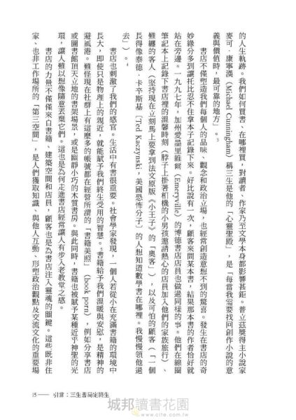 書店或許是瀕臨絕種的空間,卻也是強大的存在,只是它們的力量被古色古香的店面、穿著開襟毛衣的店員等揮之不去的形象遮蔽了。在對的時機將對的書放進對的人手中,足以改變一個人甚至許多人的人生軌跡。我們如何買書、在哪裡買,對讀者、作家乃至文學本身都影響甚鉅。普立茲獎得主小說家麥可.康寧漢(Michael Cunningham)稱三生是他的「心靈聖殿」,是「每當我需要找回創作小說的意義與價值時,最可靠的地方」。