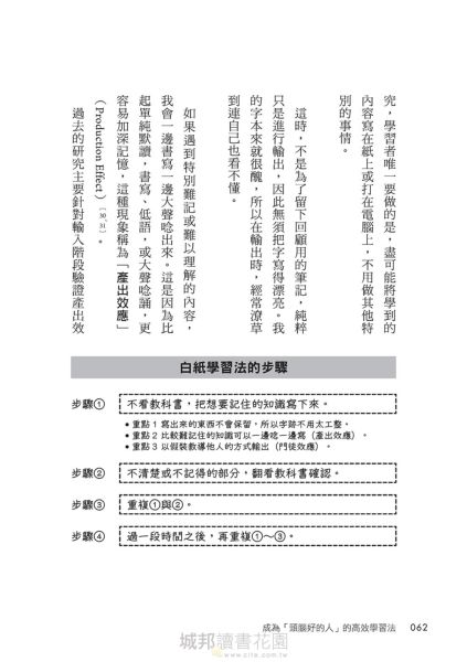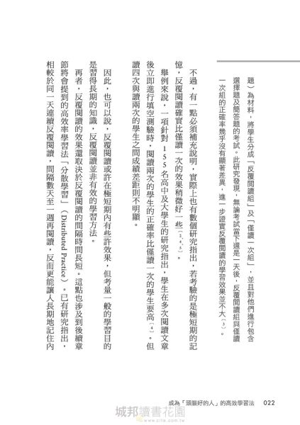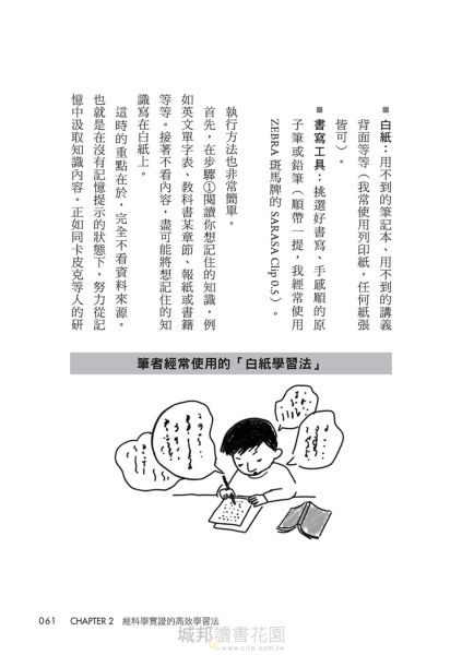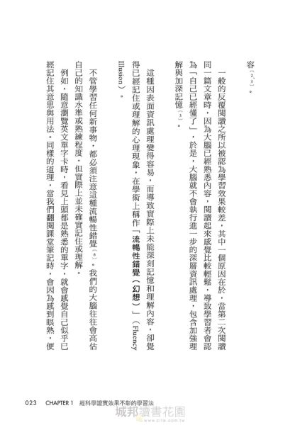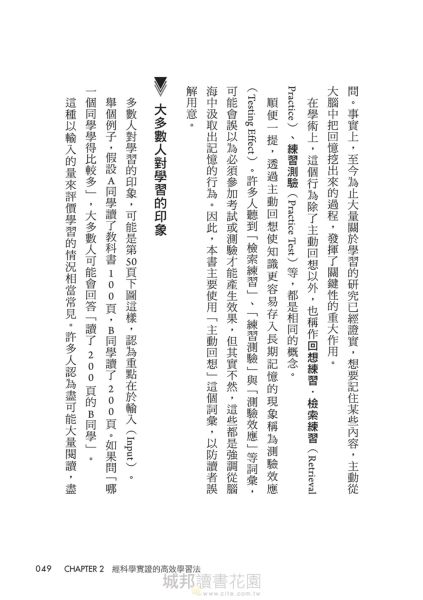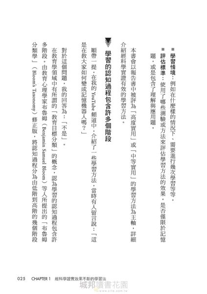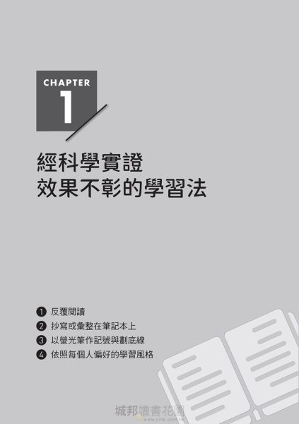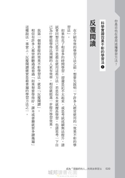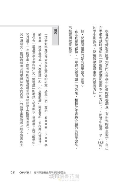 在第1章中,會先介紹那些從科學的角度看來效果不彰的學習方法。我認為,想提高學習效率的話,首先應該知道哪些是效果較差的方法,從而減少花在這些方法上的時間,將節省下來的時間運用在效果更高的學習方法上。