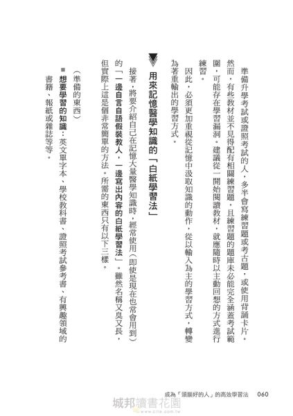 另外,本書並非專為準備特定升學考試或證照考試的人所寫,而是以所有學習者為目標讀者。本書中所介紹的學習方法,效果涵蓋語言學習、職涯發展、興趣探索,或是透過閱讀及上網收集資訊等各種學習類型。只要是涉及吸收新知識的行為,本書都能成為極有用的參考。
