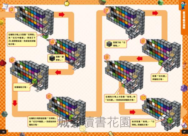 本書為了徹底解決這個難題,全書採用「高解析度 3D 俯視設計圖」!透過步驟式的 3D 立體圖示,讀者能夠清楚掌握每個方塊的精確位置和紅石元件的朝向,讓複雜的電路和多層次的結構一目瞭然,大大降低了製作失敗的機率,確保你每一個精心設計的機關都能順利運作!