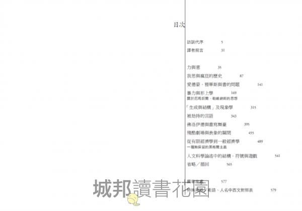 訪談代序 譯者前言 力與意 我思與瘋狂的歷史 愛德蒙.雅畢斯與書的問題 暴力與形上學 關於厄瑪奴爾.勒維納斯的思想 「生成與結構」及現象學 被劫持的言語 佛洛伊德與書寫舞臺 殘酷劇場與表象的關閉 從有限經濟學到一般經濟學 一種無保留的黑格爾主義 人文科學論述中的結構、符號與遊戲 省略/循回 篇章出處 特殊用語/術語、人名中西文對照表