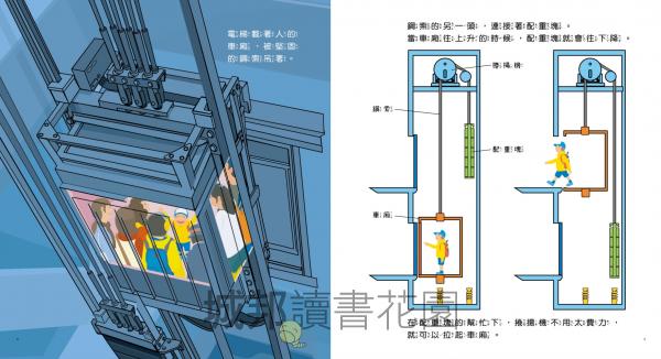 ★易理解的結構說明:清楚明瞭的機械結構與剖面圖,輕鬆理解電梯能載著人上下移動,以及手扶梯不斷有踏階從地板下冒出的背後原理。