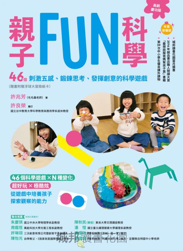 帶領小朋友學習科學,最難的就是如何在科學教學中增加小朋友探索科學的興趣,從過去的教學經驗中,最直接的方法莫過於透過動手做,發現現象與問題,循序漸進的引導小朋友,以培養科學的素養。《親子FUN科學》一書呈現作者豐富的教學經驗,每則科學遊戲除了詳實的作法與科學原理外,還提供了親子共同探索的延伸問題與其他的富有創意的想法,是一本值得推薦的好書,也是親子共學進入科學殿堂的最佳啟蒙書。
