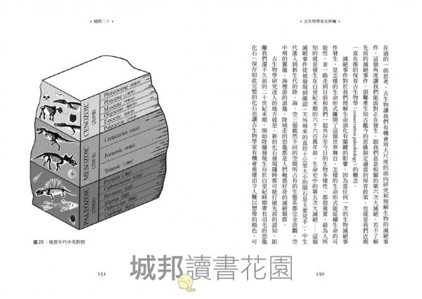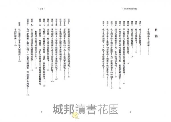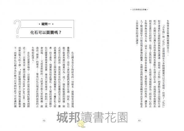 全書以二十個關於古生物你從未想過的疑問為骨架,由從事第一線研究的蔡政修老師為我們一一解答。從化石的挖掘、保存、清修、研究、交易,到古生物發展史中不為人知的趣味軼事或重大事件,到為什麼現代人還需要了解古生物的大哉問,帶著我們感受古生物學不僅是關於遠古生命的研究,也與人類理解自身的起源與未來息息相關。老師的解說兼具專業性與趣味性,獲得知識之外,更一窺古生物學家鮮為人知的工作日常。