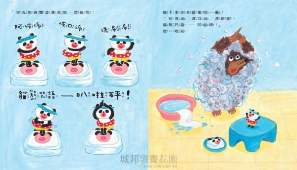這次,貓熊小湯匙跳出廚房,走進浴室,用貓熊肥皂洗澡,再唸上一段咒語 ——