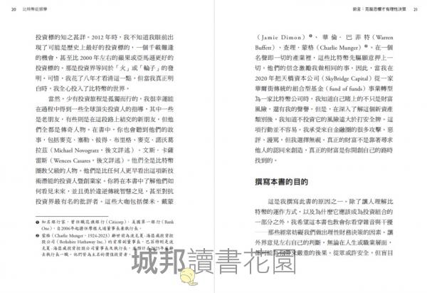 2.如幣圈故事般精采的投資入門書:作者本身的投資圈背景,使得本書能夠在「普通讀者」與「華爾街視角」之間建立橋樑──引領門外漢的你—窺投資圈的內部觀點與動態,了解真正的「從業者觀點」。