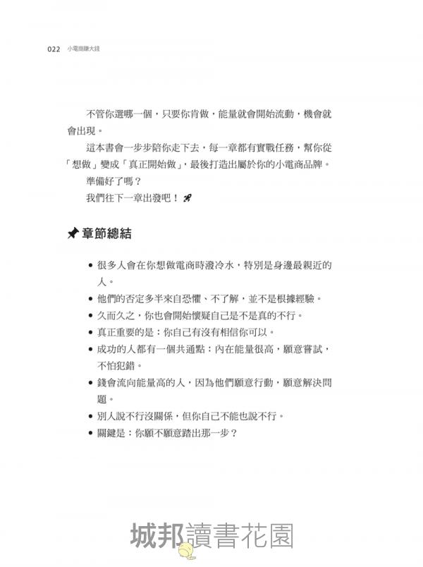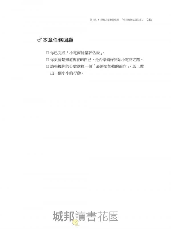 ◆ 看懂更要動手做,每章設計了練習作業,讀完就等於完成一份屬於自己的「小電商實戰規劃」。