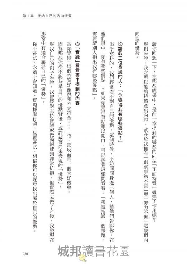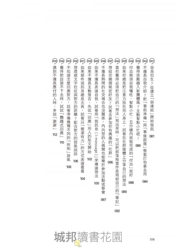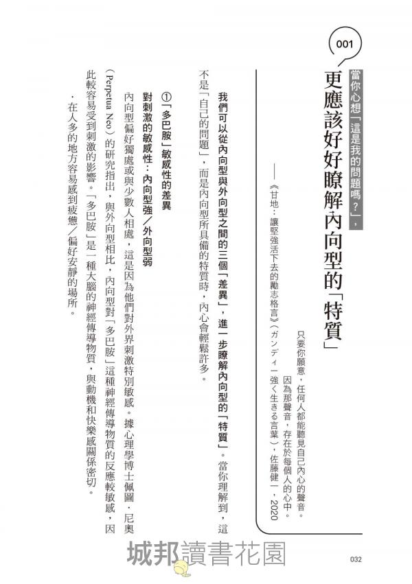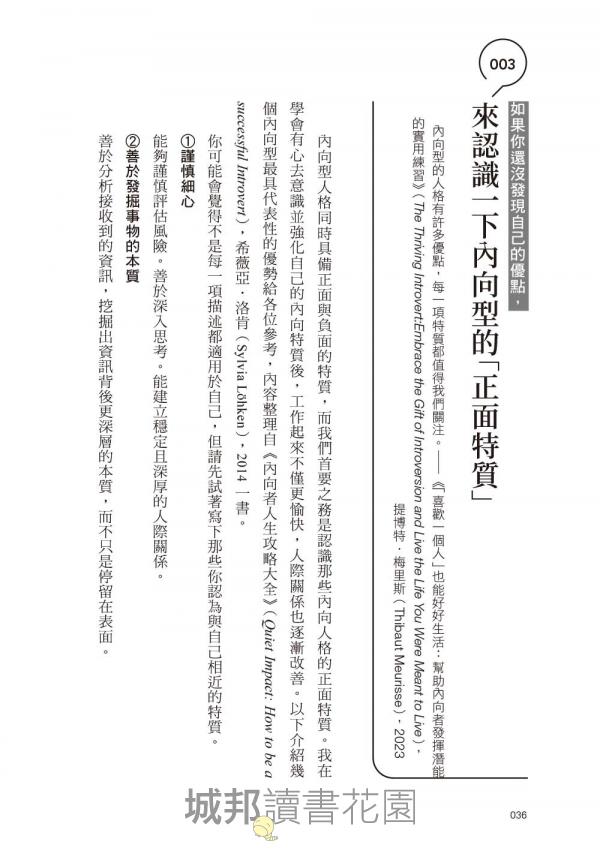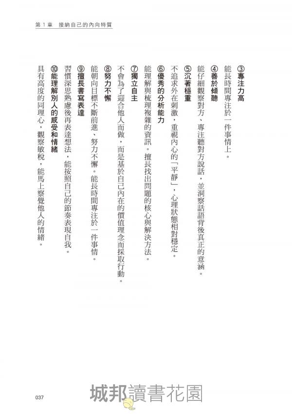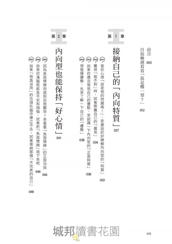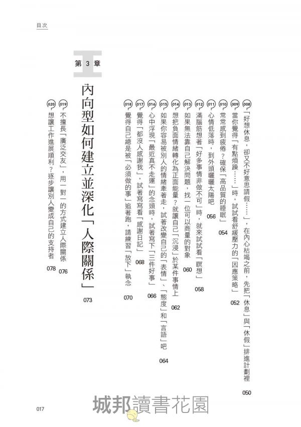 精讀超過100本心理與人格發展書籍,結合親身成長經驗。作者彙整出6大章節、提出100個具體可行的方法,從自我接納、領導力養成到積極迎接挑戰,幫助內向者在職場、生活、人際關係中,堅定前行、穩健成長。