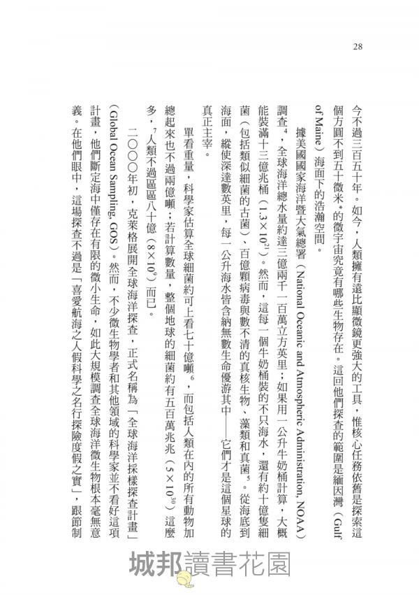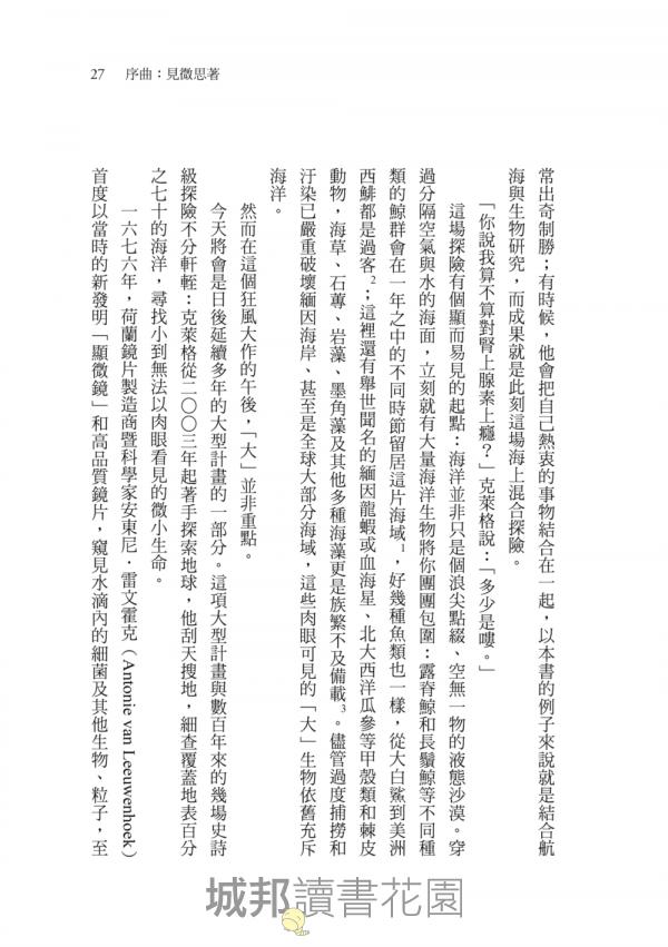 「一本在閱讀時讓人同時體驗航海探險、科學新知和人性幽微的書。揭開了海洋微生物在生命演化史上過去、現在、未來的巨大影響力。喚醒人們長期忽視自然界中『看不見的生命』的自省。」