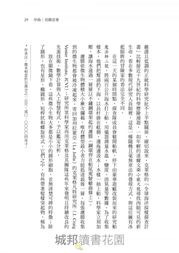 「本書結合遼闊的語言意象與犀利的科學洞見,讓讀者彷彿登上自達爾文『小獵犬號』以降最重要的科學探索船:『魔法師二號』。凡特向讀者揭示,何以地球更應該稱作『水』球,又為何海洋微生物是這顆星球中最深邃、也最神奇的基因多樣性寶庫。文字引人入勝,讀來欲罷不能,讓我們透過科學家的雙眼,窺見地球上最大卻最微小的宇宙,感受他們破解生命奧祕時的震撼。」