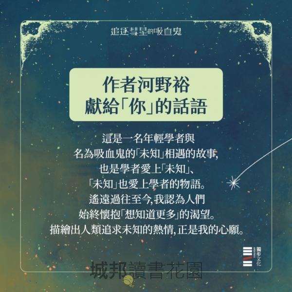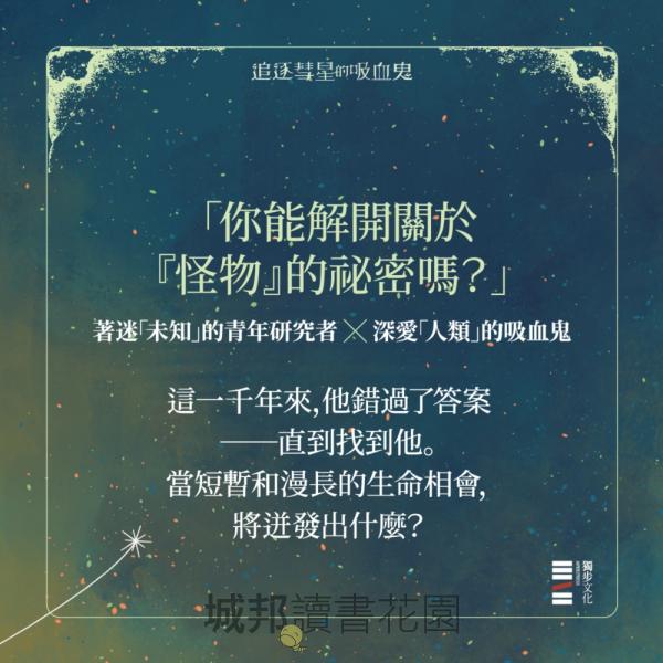 而在這段歷史的隙縫之間,是青年學者奧斯卡與古老吸血鬼阿茲之間的牽絆。不能用愛情定義,也難以用友情概括,看似點到為止,卻使人動容,闔上書頁也不想輕易放下。這將是不可思議的閱讀旅程,就像坐在繁星閃爍的蒼穹之下,聆聽一段輕聲訴說的悠揚故事。