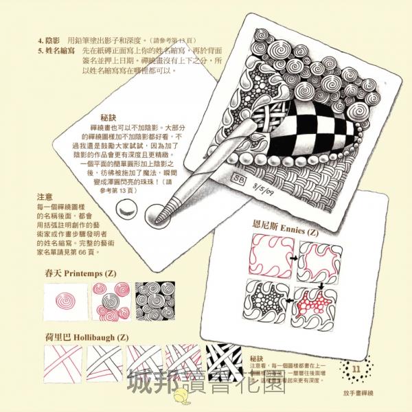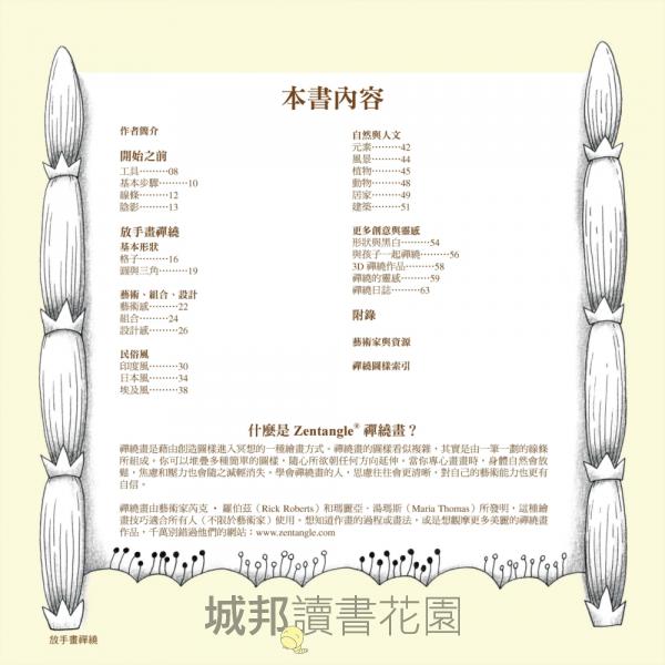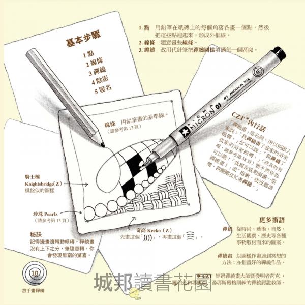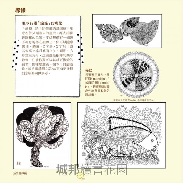 「引人入勝!雖然是一本入門好書,但也包含了很多進階的禪繞畫,作者(在書中)探索了很多組合的方法,以及如何畫出屬於自己創作的方式,這些都能使非初學者深受啓發。」