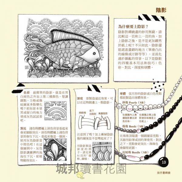 「完全愛上它了!我不會畫畫,但在照著(書中的)步驟說明來做之後,對於產生的結果非常驚訝……(書中)關於陰影的說明很好用。我發現禪繞非常舒壓,等不及想看看自己能畫出怎樣的作品來。」