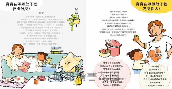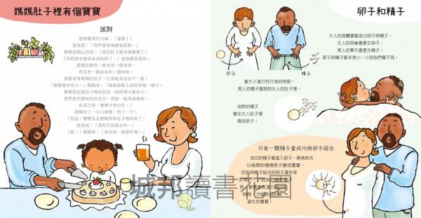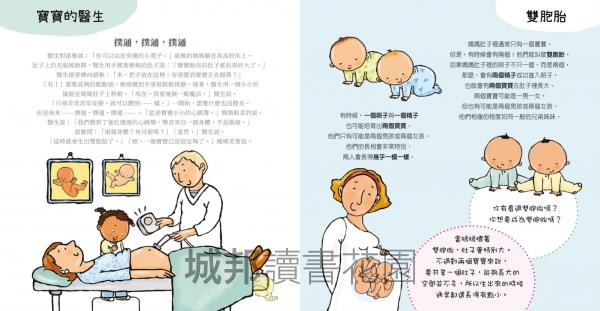 透過可愛插畫與貼近孩子的故事,以輕鬆自在的方式,教導孩子了解女孩、男孩與女人、男人的不同,認識卵子和精子、理解什麼是性行為,接著學習懷孕時每個月份媽媽和寶寶的模樣,以及懷孕到生產過程的各個環節。