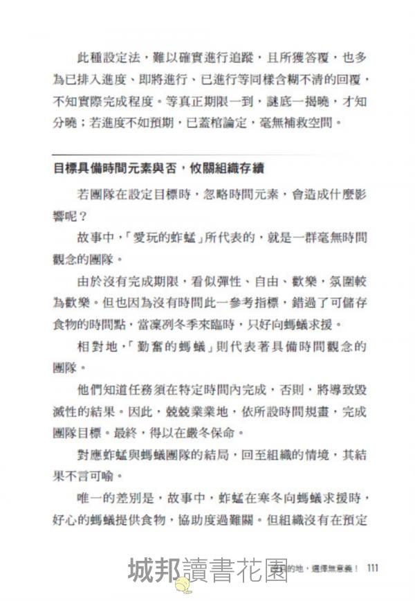 第二章,則進入績效管理的第一個階段:期初目標設定。其中,透過《愚公移山》體會目標設定的價值,即使難如移山,也能展現成果。並援引《曹沖秤象》象與石頭之間的「轉化」,學習如何將質化目標轉化為量化指標。