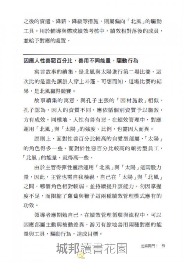 這本書深入淺出以智慧寓言,幫助讀者了解績效管理制度,對於想要提升個人層面的績效,能夠有條理漸進的了解步驟與方法,掌握自己的優勢與待加強之處,在職涯發展旅程中逐步踏實而增進歷練。