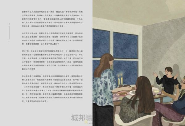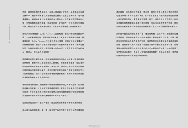 為什麼「吃」令人感到罪惡? 罪惡和享受,看似對立的情緒,卻巧妙地互相牽連。有的時候,越強大的罪惡感會伴隨著更強烈的滿足,像是慢跑後來一杯沁涼的啤酒,在週間晚上追了三小時的劇,或是把蛋糕當作早餐等等。每個人的罪惡感都有不同的來源,而時常被重複提及的,就是食物。 飲食對有些人來說是單純的享受,然而,對我來說,食物常夾帶著一絲難以形容的罪惡感。別誤會,我很愛吃,也喜歡與我所愛的人分享美食。但是有時候我會對於吃完一整個濃郁甜膩的開心果可頌感到罪惡。不久之後,我又會對自己的罪惡感感到羞恥。原本這個可頌應該是要替我的生活帶來快樂,卻因為自己嚴厲的標準瞬間變成了負擔。 自從我有記憶以來,我對於食物的罪惡感似乎從來沒有離開過。很多時候家人點了飯後甜點,我明明也想吃一塊蛋糕,卻常常用自己已經飽了為理由婉拒。長時間下來的抑制自己的慾望,讓我感到心疲力盡。如果每個享樂,都牽掛著罪惡感,這人生豈不是太難了? 2022年,我從波士頓搬到位於美國東北部最小的一州、羅德島中的小鎮普羅維登斯,在羅德島藝術學院念兩年的研究所。小鎮生活很平凡,市區只有一條主要幹道,充斥著高檔餐廳和美式酒吧。除了上課,和在自己的工作室創作,常常閒得發慌,也很想念在台灣的家人。因此,我便每個週末舉辦晚餐派對來招待朋友,讓自己忙碌、生活熱鬧些,以及和朋友聊些藝術以外的事情。 從大概小學六年級開始,我便常常在廚房當媽媽的小幫手。當時的我也許對人生毫無方向,但能把家人餵飽給了我很大滿足跟成就感。如今在一個科技資訊發達的時代,煮菜是我放鬆、療癒自己的方式,因為我可以在這一小時的時間活在當下,專注於烹飪而不受外界雜訊的干擾。在美國這六年,我像是個蝸牛一樣搬了八次家。家具常常在搬家過程中賣掉而買新的,但一路陪著我走的,是那些精心收藏的餐盤。我總是認為美麗的擺盤可以讓食物更好吃,而晚餐派對也給了我新的理由購買更多的盤子招待朋友、分享食物以及彼此的祕密。 為了每週的晚餐派對,我都會自己設計並印出菜單,點上蠟燭,播放著輕鬆的音樂,給予我的聚會一些儀式感。第一次的派對,我做了Alison Roman的檸檬椰棗一鍋雞,另一週,我則是燉了媽媽常做的紅酒燉牛肉。有的時候會讓我的客人DIY做披薩,自己放上大量的莫札瑞拉起司、生火腿和芝麻葉,再淋上橄欖油和義大利黑醋。隨著我舉辦的晚餐派對越來越多,我越來越喜歡大家來家裡吃飯聊天的感覺。 在某次的晚餐上,我和一位來自土耳其和另一位則來自委內瑞拉的女性朋友,在喝了幾杯酒後,突然聊起了彼此和食物、容貌的關係。其中一個朋友跟我說,她曾經經歷過暴食和催吐的惡形循環,而另一位友人則說在看完內衣品牌Victoria's Secret走秀後,對自己的身材感到焦慮。 我當下也分享了自己在國中時期,曾經有減肥的經驗,對自己容貌感到非常不安。但同時,我也很猶豫是不是要把更多的細節和我的朋友們分享。我覺得每搬到一個新的城市,過去急於減肥的自己似乎就離我越來越遙遠,或許也是自己想要盡力忘記那段黑暗的記憶。當天晚上,我害怕她們如果知道我曾經是個十分追求健康的完美主義者,會不會就從此用不同的眼光看待我。畢竟誰會覺得一個愛吃沙拉又愛運動減肥的人有趣呢? 然而,當晚朋友們的勇敢坦白,在我心裡迴盪了好幾天,反思著自己在過去幾年中,對於身材焦慮以及健康態度的變化。生長在台灣的我,從小就覺得嬌小、纖細的女生比較容易被社會大眾肯定。然而來自不同國家的女性,也常有體態焦慮的困擾。因此我更進一步地思考,文化背景如何塑造一個人對自己身材或是美感的看法,以及如何影響每個人的健康習慣。 我很久以前就聽過「Guilty Pleasure」這個概念,意指「帶有罪惡感的享受」,但在深度研究後,我發現這個詞彙充斥著兩個互相衝突的情緒。更重要的是,Gulity Pleasure不只是包含私人情緒,它還反映了社會體系下的結構性問題。例如,社會對女性有很多不切實際的審美標準、資本主義對於工作效率的期待等等,進而影響女性的心理,以及女性對自己在社會上、經濟上、文化上的自我認定。 罪惡感是非常主觀的感受,往往背後都有許多很私人的故事。很多時候我在訪問時,都覺得自己像是窺探別人的隱私,畢竟誰會想要跟一位記者承認自己感到罪惡的原因跟事物呢?儘管如此,我訪問了十四位在新英格蘭地區從事食品業的當地女性,這些行業往往提供讓女性體驗到既愉悅又令人內疚的產品。而另一些女性受訪者從事健康產業,她們的工作則傾向於作為前者的補救甚至良性替代品。 每個受訪者都提供了她們對於「帶有罪惡感的享受」的獨特見解,包含對這個概念的定義、以及其感到罪惡感的原因。有些人因為產品的昂貴而感到罪惡 ; 有些則是因為小時候被父母禁止食用而感到罪惡;有些女性則是因為覺得某些食物對健康和身材管控不利而感到羞恥。 在我的研究過程中,很少人會說,自己從來沒有對享受食物而感到罪惡。 這本書分為四個章節。第一章,我分享了自己在青少年時對減肥和體態焦慮的經驗,以及我的研究動機。第二章,我用了許多社會和科學的文章來佐證為什麼「帶有罪惡感的享受」是一個性別議題,而究竟是哪些因素讓女性比起男性而言,更容易感到罪惡。第三、四章分