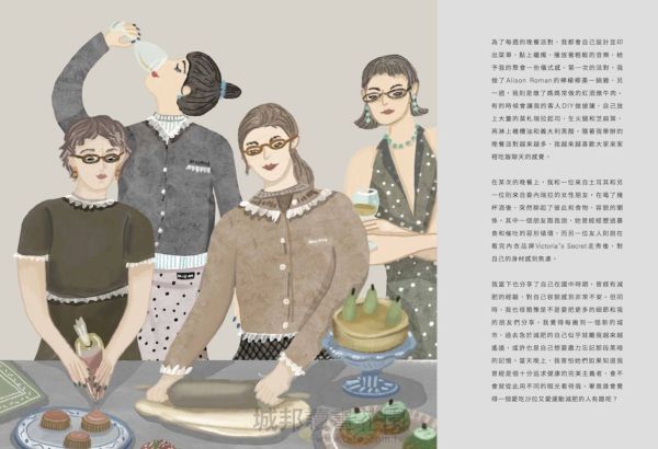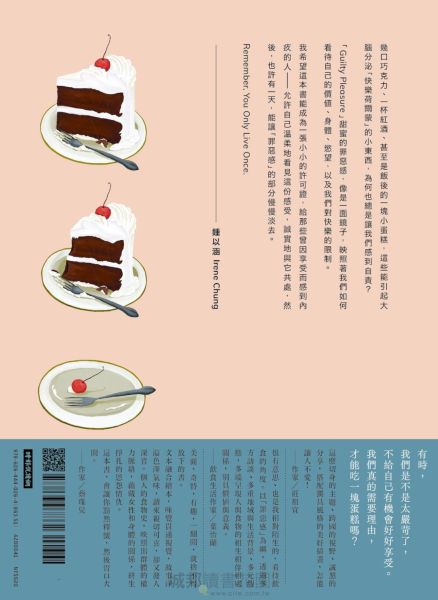 ~甜蜜的罪惡感~ 【中英文雙語對照】 有時,我們是不是太嚴苛了,不讓自己有機會好好享受。 我們真的需要理由,才能吃一塊蛋糕嗎? ——致每一位曾在食慾前掙扎的妳—— 什麼是妳的「Guilty Pleasure」? 是飯後一道甜點、還是把甜甜圈當作一天的開始? 新生代圖文作家 鍾以涵 寫(畫)下女性「想吃又覺得不該吃」的焦慮時刻 ※特別收錄※ 20位台美專業女性訪談—— 飲食作家、總統御廚、餐廳主廚、品酒師……面對美食當前時的內心交戰。 ◎ 關於飲食與女性的外貌焦慮 ————這些發自內在真實的聲音來自哪裡? 嘿,女孩們,你一定也有這樣的經驗:一邊對著眼前這塊草莓蛋糕垂涎不已,一邊心裡想著「今天已經吃太多了⋯⋯不該吃甜點⋯⋯」 我們為什麼會對於吃東西感到內疚? 幾口巧克力、一杯紅酒、甚至是飯後的一塊小蛋糕,真的有這麼「罪惡」嗎? 那些能引起大腦分泌「快樂荷爾蒙」的小東西——美食、消費 為何也總是讓我們感到「不該這麼做」的自責感? 新生代圖文作家鍾以涵(Irene Chung)生長於台北,於美國求學與發展職涯,專業橫跨健康科學、新聞與插畫藝術,其畫風既帶有美式時尚的鮮明色彩,也充滿了日常生活的溫暖筆觸。 如同其創作始於對現實生活的觀察,鍾以涵從自身經驗出發,探索女性介於「罪惡」與「愉悅」之間的矛盾感受,想吃又不敢吃,覺得自己不夠完美——這些對於身材的焦慮與自責,是來自我們內在真實的聲音? 還是受到大眾消費文化、理想身材、健康飲食等外在標籤的影響? ◎ 20位專業女性的生命故事 ————關於Guilty Pleasure,她們怎麼說? 作者回看自身成長經歷,梳理消費文化的歷史脈絡,也專訪了20位來自美國與台灣的女性,她們有的是餐廳主廚、巧克力品牌創辦人、飲食作家、藥局經營者、瑜伽老師、運動服飾的品牌創辦人⋯⋯ 皆在餐飲產業與健康專業領域中占有一席之地。 有趣的是,即使有著不同文化背景與獨特的生活樣貌,每個人卻都在心底,或多或少懷有一份似曾相識的「甜蜜的罪惡感」(Guilty Pleasure)與身材焦慮。 ・練習身體與人性的平衡 「你永遠都會對自己的身體有意見,這是人性。所以我一直在練習——練習找到那個平衡點。當我因為某些享樂感到罪惡,我就會試著往內探索:這種罪惡感從哪來?它真的是我自己的聲音嗎?」 ——運動服飾品牌創辦人 托茵・奧米索雷 (Toyin Omisore) ・保持健康,但不會放棄麵包 「我認為這些健康產品的廣告讓女性改變了她們看待自己身體的方式⋯⋯當然,我會努力保持健康,讓自己活得更久,但我可不會因此放棄桌上的麵包。」——百年義大利餐廳經營者 潔美・安蒂尼亞諾(Jamie Antignano) ・明明不餓,卻還是想吃? 「我的罪惡享受是宵夜,但對宵夜的罪惡感並不是來自於怕發胖,而是一種道德上的自我譴責。會覺得,為什麼自己無法控制嘴饞,明明不餓,卻還是想吃,這種無法自律的感覺,讓我覺得自己很可憐。」 ——作家 蔡珠兒 ・傳統審美標準仍深植內心 「朋友總說我是『可愛型』,但傳統審美標準仍深植內心,讓我不由自主地想要變得更瘦、更符合大眾認定的美。為什麼我對別人這麼寬容,卻總是對自己挑剔?」 ——Keya Jam 柯亞果醬創辦人 柯亞 ・依循感覺去吃與運動 「『女為悅己者容』這句話真是糟糕透了!依循自己的感覺去吃與運動,達到內外在的平衡,自然就會有健康的體態。」 ——飲食生活作家 葉怡蘭 ・找回與美味連結的快樂 「與其活在食物計算與身體焦慮之中,更重要的是找回那份與美味連結的純粹快樂——一種不被審判、也無需辯解的快樂。」 ——起司品牌創辦人 安吉・迪米奧(Angie DiMeo) ・餓著睡覺會覺得自己很可憐 「時不時還是會有體態壓力⋯⋯當廚師有很多勞力工作,回家半夜就會想吃宵夜,因為肚子餓著睡覺就會覺得自己很可憐。」 ——敬時里里私廚 杜敬萱 ・糖和快樂本身也是一種營養 「雖然大家覺得甜點沒有什麼營養價值,但糖和快樂本身也是一種營養⋯⋯太健康的甜點,可能會少了一些享受的感覺。」 ——Quelques Pâtisseries某某法式甜點主廚 賴怡君 ・職業本身就是帶有罪惡感的享受 「當你的職業本身就被社會視為「帶有罪惡感的享受」,你便很難感到罪惡了。」 ——專業品酒師 莉亞・溫希普(Leah Winship) ・罪惡感是讓人會心一笑的小確幸 「作為一位美食愛好者,我從不認為食物應該與罪惡感或羞恥感掛鉤。帶有罪惡感的享受就是一種讓人會心一笑的小確幸。」 ——《波士頓環球時報》食物專欄記者 雪柔・朱利安(Sheryl Julian) ・今天過得不好,我就吃巧克力 「我一輩子都是肉肉的,大約20年前,我決定就放下算了。如果我今天過得不好,我就吃巧克力,明天想運動就去運動。」 ——巧克力品牌創辦人 歐拉・法哈多(Aura Fajardo) ◎ 讓罪惡感慢慢淡去? ————溫柔地看見這份感受,誠實地與它共處 「Guilty Pleasure」甜蜜的罪惡感 ,像是一面鏡子,映照著我們如何看待自己的價值、身體、慾望,以及我們對快樂的限制。 我希望這本書能成為一張小小的許可證,給那些曾因享受而感到內疚的人—— 允許自己溫柔地看見這份感受,誠實地與它共處,然後,也許有一天,能讓「罪惡感」的部分慢慢淡去。 ————————————————鍾以涵(Irene Chung)