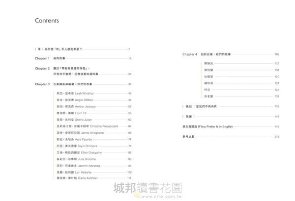 ・序——為什麼「吃」令人感到罪惡? Chapter 1 我的故事 Chapter 2 關於「帶有罪惡感的享受」,所有你不敢問、但應該要知道的事 Chapter 3 在美國新英格蘭,她們的故事 莉亞・溫希普 Leah Winship /專業品酒師 安吉・迪米奧 Angie DiMeo/起司品牌創辦人 安珀・傑克森 Amber Jackson/茶葉品牌創辦人 楚瑞特・奧爾 Tzurit Or/烘焙咖啡廳創辦人 雪柔・朱利安 Sheryl Julian/《波士頓環球時報》食物專欄記者 克莉絲汀娜・普羅卡錢蒂 Christina Procaccianti/獨立藥房共同創辦人 潔美・安蒂尼亞諾 Jamie Antignano/百年義大利餐廳經營者 歐拉・法哈多 Aura Fajardo/巧克力品牌創辦人 托茵・奧米索雷 Toyin Omisore/運動服飾品牌創辦人 艾倫・格拉西爾尼 Ellen Gracyalny/高級餐廳主廚&經營者 茱莉亞・布魯姆 Julia Broome/餐廳老闆 茉莉・阿塞維多 Jasmin Acevedo/瑜伽老師 洛麗・凱特爾 Lori Kettelle/甜甜圈品牌創辦人 戴安娜・庫什納 Diana Kushner/紀錄片導演、有機農場主人 Chapter 4 回到台灣,她們的故事 蔡珠兒/作家 葉怡蘭/飲食生活作家 杜敬萱/敬時里里私廚 賴怡君/Quelques Pâtisseries某某法式甜點主廚 柯亞/Keya Jam 柯亞果醬創辦人 許名慧/前總統蔡英文的御廚 ・後記——當我們不再內疚 ・致謝 ・英文典藏版 If You Prefer It in English ・參考文獻