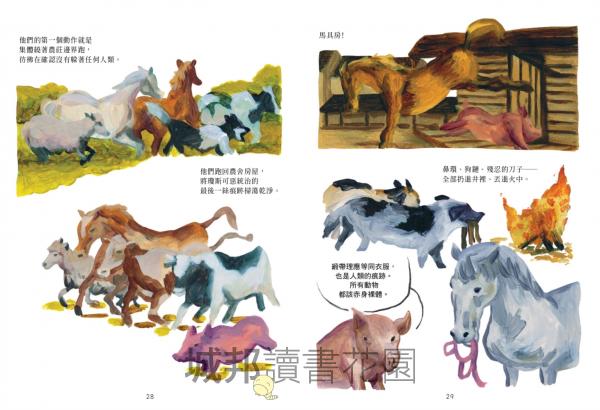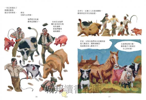 這本色彩鮮明、向喬治・歐威爾寓言致敬的作品,優雅又令人心碎。繪者Odyr筆下的動物們從掙脫束縛,到承受革命後果,畫面極富感染力——自由奔放又充滿啟示。