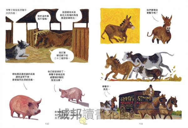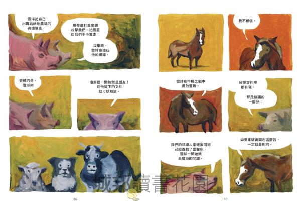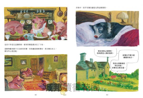 《動物農莊(圖像版)》由官方機構正式授權,透過寓言故事的形式,搭配風格鮮明、筆觸優雅的視覺圖像,讀者將隨著豬隻一步步掌權的過程,看見每個國家、社會乃至企業組織中,人性的貪婪是如何不斷上演。本書有趣、通俗之餘,深入刻劃階級衝突與政治運作,有如敲響世世代代的警鐘,鼓勵批判性思考、在權力的鬥爭中保持清醒,是每個人一生必讀的政治文學經典。