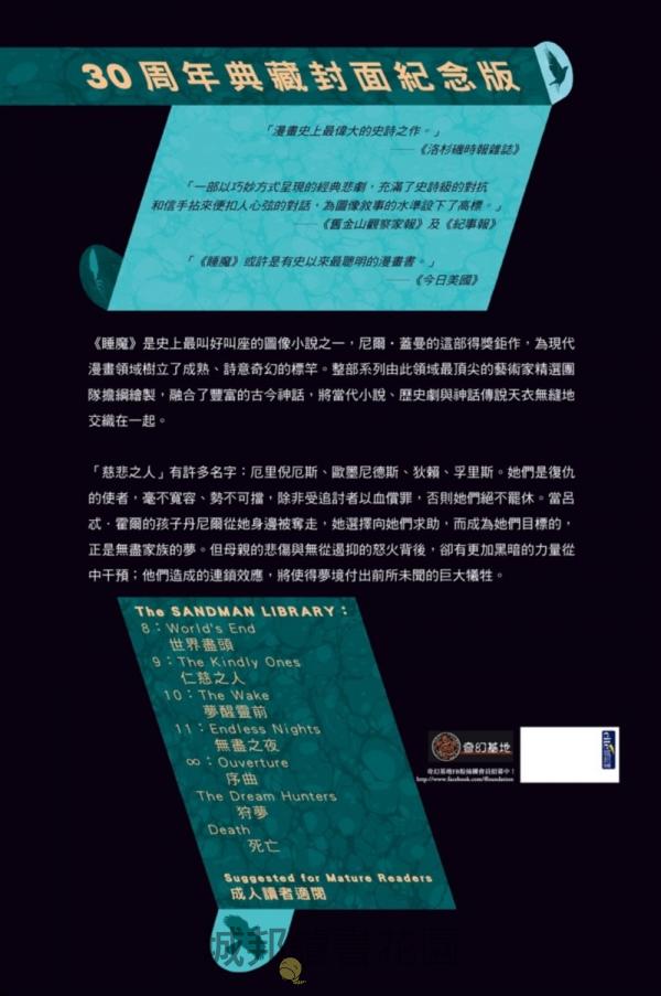 尼爾.蓋曼筆下的這本漫畫鉅作⋯⋯在內容和風格方面都展示了漫畫作為媒介的龐大表現力。——《出版者週刊》(Publishers Weekly)