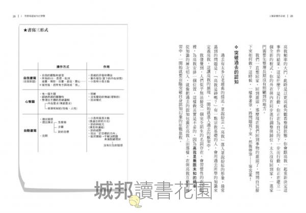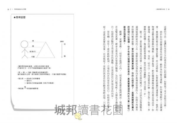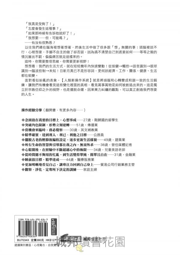 快速變化的時代,創造想要的改變! 力量就在我裡面,只有當我決定改變自己時,它才會湧現。 ◆心想事成理論實踐操作版◆ 先不用強迫自己正向思考,更不需壓抑, 思想就是你的旅程,透過書寫去發現自己的真相吧! 精緻你的目標,專注你的創造,美化你的品德,高尚你的視野…… 保持「心」上沒有負擔和包袱,直覺就輕而易舉地水落石出。 你可以從整天胡思亂想的狀態,變成天真坦直、沒有煩惱的人。  「我真是受夠了!」  「怎麼會發生這種事?」  「如果那時候有告訴他就好了!」  「我想要……但,可能嗎?」  ……有沒有很熟悉?  以往我們總在腦海裡想著想著,然後生活中做了很多跟「想」無關的事;頭腦裡說不行,心裡想要,手腳不自主的做了卻否認,因為搞不清楚自己到底要如何……等等之類的情況層出不窮,偏偏痛苦就是這樣來的。  這時,你需要整理思緒,你需要更新視野!  想想看:我們的生活方式,就在短短幾年內快速變動!從按鍵->觸控->語音識別->眼球識別->腦波控制->未知!日新月異已不是形容詞,更何狀經濟、工作、關係、健康、生活都在蛻變。  面對看似紛亂的表象,【人類新操作系統】就是將頭腦和心轉變成和諧一致的生活鍛鍊,讓我們有機會看見這些變化裡面的真相,看見萬事萬物是如何被創造出來的。這是獨立於宗教信仰之外的視野,也是擺脫命運、因果業力糾纏的觀點,可以真正創造我們想要的人生。  怎麼做呢?重點是: ★持續書寫  做筆記、寫日記,早已不是新鮮事,但這種書寫通常是記錄已知或抒發情緒。「人類新操作系統」強調的書寫有些不同,形式分為三種:一、自我對話,二、心智圖,三、自動書寫。這三種層次的書寫可以讓我們更有覺知,協助人們更具體的看到「內在本來流動的舊意識」是如何操縱著物質世界的一切,再佐以高我(內在智慧)提供出來的觀點,來達到改變和扭轉結果的目的。請記住,剛開始,任何內心的反應,都不需要去壓抑,只需要去看見,然後寫下來—— ★放「文字目標」  書寫後,用精簡的文字定出目標。最好的放目標時間是睡前,步驟如下: ---------------------------------------------------------------------------- 1.回顧白天發生的事,書寫後,訂出目標 → 精簡的文字 2.11:00pm~1:00am,在腦海中想著文字目標 3.睡醒不睜眼,先回想起目標(今天我要 ) →再次校準主體意識所在的空間 4.睜眼立刻記錄 夢境 回想目標時,閃現的訊息 5.白天留意直覺,依據直覺行動 ----------------------------------------------------------------------------  為什麼要用文字?影像畫面不行嗎?其實【人類新操作系統】裡的設定目標,不同於吸引力法則所教的「想像畫面」,因為在文字裡有「意識」的振動模組,與影像的層次不同,文字不會被過去的經驗綑綁設限,這才是真正的創造。透過書寫、放目標,是在整合自身的內容物,是很浩大的工程,但也是腳踏實地做人的根本。 ★保持覺知去行動,學會樂觀、感恩和轉念  直覺不是想起過去的人或事,不是由外界(特別是視覺)所引起的反應,也不是看到電視廣告想打電話去訂購的行動,而是獨立出現的訊號。直覺的能量形式屬於高速振動的模式,要有足夠的空間接收訊號;太過忙碌的生活,直覺很難被看見並落實。運用書寫的方式讓我們弄清楚,這樣的覺知讓我們擴展看事情的角度,在每一件事情上找到禮物,並帶進生活中成為助力。在每一個片刻中去覺知內心的振動,就能一步步有效的認識到自己的內容和界限,為自己用心做功課,腳踏實地的活著。