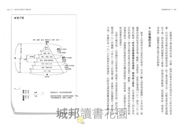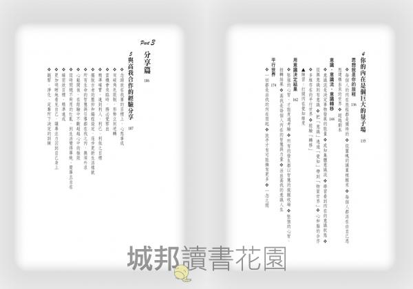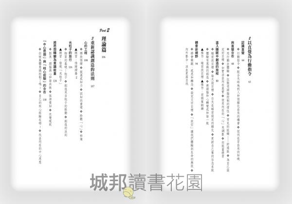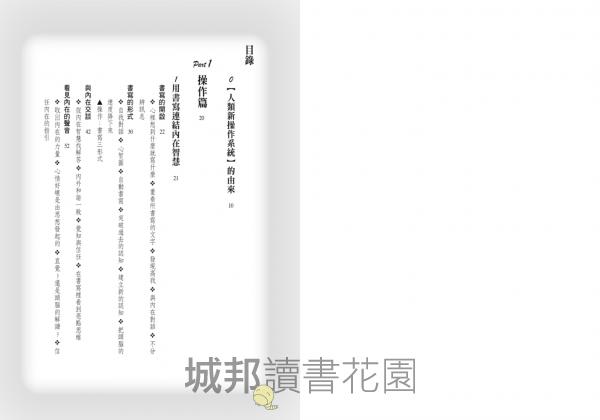 作者序 「人類新操作系統」的由來 Part 1 操作篇 1 用書寫連結內在智慧 書寫的開啟 ❖心裡想到什麼就寫什麼 ❖重看所書寫的文字 ❖發現高我 ❖與內在對話 ❖不分辨訊息 書寫的形式 ❖自我對話 ❖心智圖 ❖自動書寫 ❖突破過去的認知 ❖建立新的認知 ❖把頭腦的速度降下來 ▲操作:書寫三形式 與內在交談 ❖從內在智慧找解答 ❖內外和諧一致 ❖覺知與信任 ❖在書寫裡看到亮點思維 看見內在的聲音 ❖取回內在的力量 ❖心情好壞是由思想發起的 ❖直覺?還是頭腦的解讀? ❖信任內在的指引 2 以直覺為行動指令 認識直覺 ❖行動指令 ❖配合天時地利人和而顯化出來的機會 ❖從內在冒出來的知曉 與直覺合作 ❖用行動去體驗 ❖征服受頭腦控制的慣性 ❖常見的阻礙——舒適區 ❖為自己設定好目標 ❖如實活出內在真實 ❖使用內在的「心」來調整 ❖向能量學習 進入睡眠中創造的旅程 ❖睡前放目標 ❖每天設目標 ❖白天是睡前設定的顯化 ❖更新自己舊的信念系統 ❖體驗有意識的創造 ❖將頭腦和心轉變成和諧一致 ▲操作:睡前放目標 ▲操作:前額葉鍛鍊 體會新視野 ❖學會樂觀、感恩和轉念 ❖設定文字目標 ❖「放空」讓我們體驗到生命的無限 ❖內外整合,活出更高自我 Part 2 理論篇 3 重新認識創造的法則 心的工程 ❖釋放情緒 ❖提高感知力 ❖認知的重建 ❖聆聽「心」 ❖粹煉 ▲練習:情緒掃毒™ 光粒子的旅行 ❖物質的基礎——粒子 ❖創造來自粒子的振動 ❖創造的法則 ▲練習:發現「光粒子」 將思想轉變為意識能量 ❖對焦:頭腦與心和諧共振 ❖保持覺知 ❖改變現狀 「中心思想」與「核心經驗」的合作 ❖你被集體意識控制了嗎? ❖自己的核心經驗在哪? ❖找出內在的中心思想 4 你的內在是個巨大的量子場 思想就是你的旅程 ❖每個人的內在旅程都是獨特的 ❖從靈魂的課業裡醒來 ❖每個人都活在由自己思想建構出來的世界 ❖超越劇本 意識、意識流、意識轉移 ❖意識流是決定事物發展的能量 ❖感知集體意識流 ❖學習看到內在的意識狀態 ❖從無意識到有意識 ❖把「意識」透過「覺知」帶到「物質世界」 ❖心和腦的合作❖多維存在的平行世界 ❖經驗「轉移」 ▲練習:打開內在覺知維度 用意識決定結果 ❖堅強的心智,才能度過考驗 ❖所有的發生都以智慧的提醒收場 ❖堅強的心智,扭轉結果 ❖高我是每個人內在的智慧與力量 ❖活出高我的意識人生 平行世界 ❖一切都是由我的內在而起 ❖放手才有可能擁有更多 ❖一念之間 Part 3 分享篇 5 與高我合作的經驗分享 ❖念頭放在我要的目標上,心想事成 ❖突破角色限制,形勢立刻逆轉 ❖當機會來臨時,務必覺察 ❖精準確實,達到利人、利已、利他之目標 ❖擺脫古老的壓抑和編程設定,逐步更新生活樣貌 ❖所有生命的智慧與引導都在我之內,無須外求 ❖心鬆開後,在經驗中不斷超越心中的極限 ❖從時間總不夠用的忙亂,到生活變得單純、簡單且自在 ❖睡前放目標,精準達成 ❖更加明晰地看見自己,讓專注力回到自己身上 ❖觀察、淨化、定奪所下決定的訓練 後記