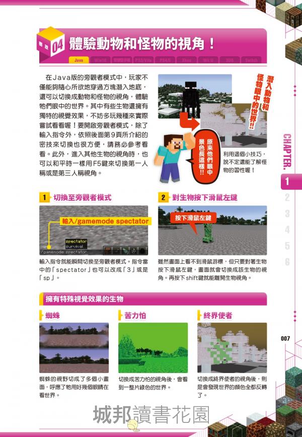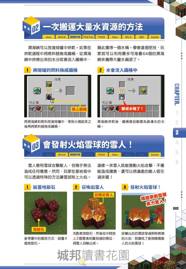 建築黑科技:想蓋秘密基地?你可以學會利用「書本位置」啟動的隱藏門,或是利用粉雪製作只有你知道的隱藏通道,讓你的寶藏絕對不會被朋友發現。 甚至連「即使在陸地上也能獲得海靈祝福」這種違背常理的神奇技巧,這本書都幫你準備好了!
