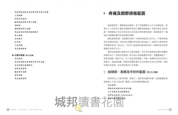 本書將透過步驟與圖解,帶你學習MELT運動表現訓練法的動作,並且用運動醫學的前端研究讓你瞭解這套方法的科學原理。此外,本書也提供適合不同生活型態讀者的MELT訓練課表,不論你是久坐少動的上班族、勞動工作者,抑或是運動愛好者或職業運動員,你只需要每天花15分鐘,就能獲得更好的生活與訓練品質。MELT運動表現訓練法綜合了作者30年的徒手治療經驗,至今已在16個國家影響了數千萬人。現在就打開本書,給你自己一次機會,迎接無痛且更美好的生活吧!