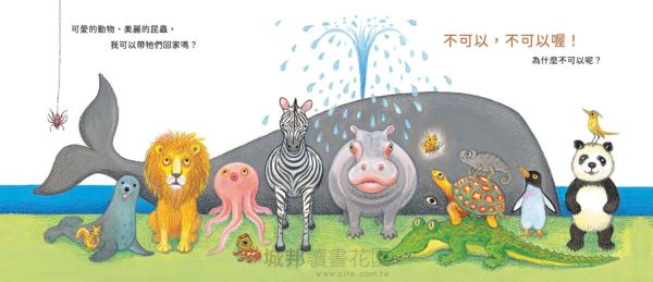 每個小朋友都有過異想天開、想把全世界的可愛動物都帶回家的願望,但這些動物不一定那麼「居家」,有的太大、有的太吵,帶出門可能很耀眼,帶回家卻會讓人眼神死。當媽媽說不可以,爸爸也說不可以,幾米用貼近孩子的角度跟孩子說,為什麼「不可以」!