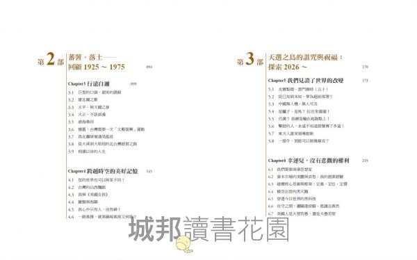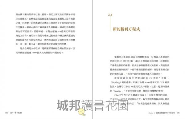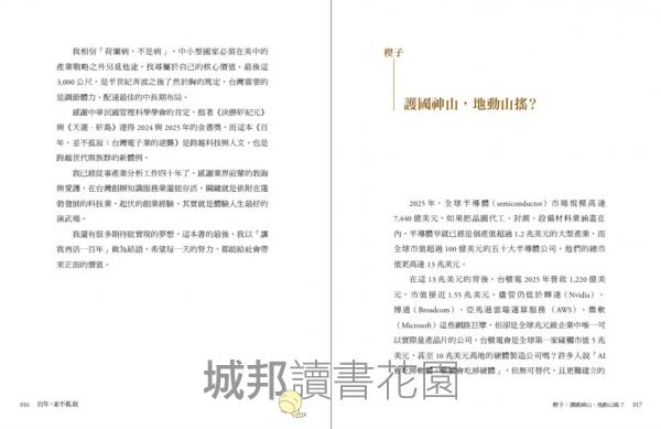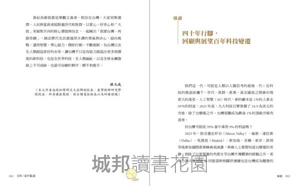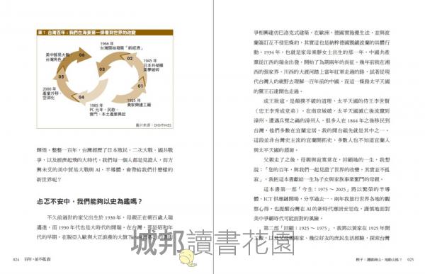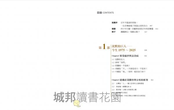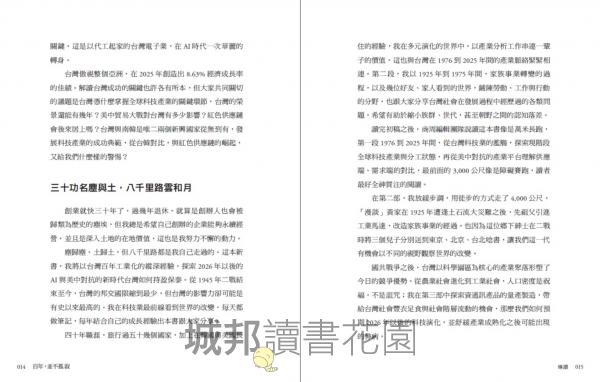 1|一部以電子業為主軸的百年台灣產業史:本書以百年視角貫穿台灣從農業社會到成為全球科技樞紐的轉變,從 1925 年宜蘭頭城的家族工廠、1970~2020 電子業崛起,到 AI 時代的國際競逐。作者以自身產業經驗為切口,引導讀者思考──台灣如何從邊陲小島,成為世界不可或缺的科技強權。