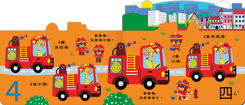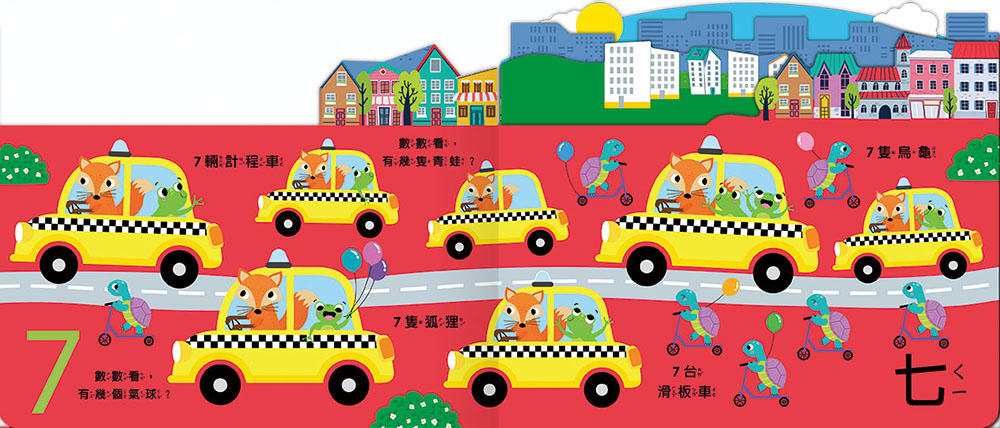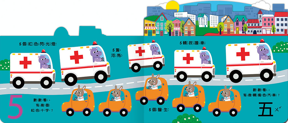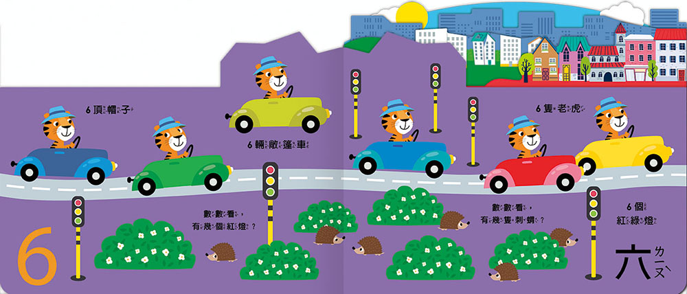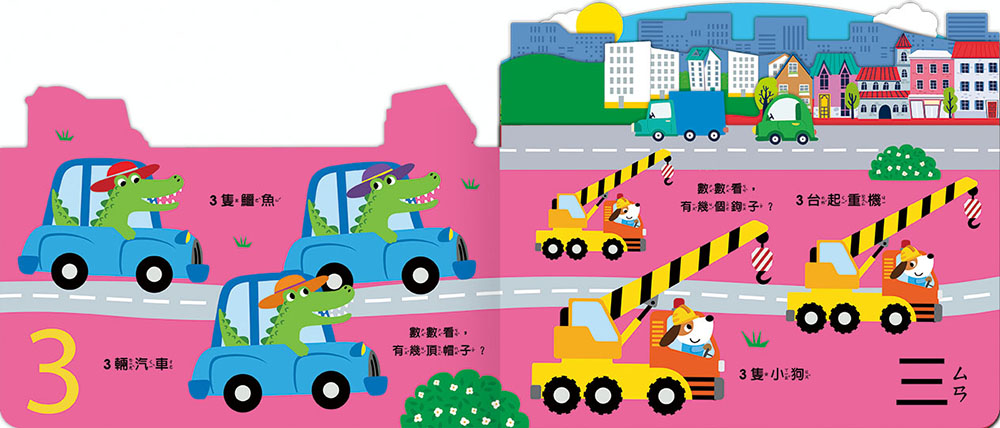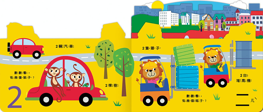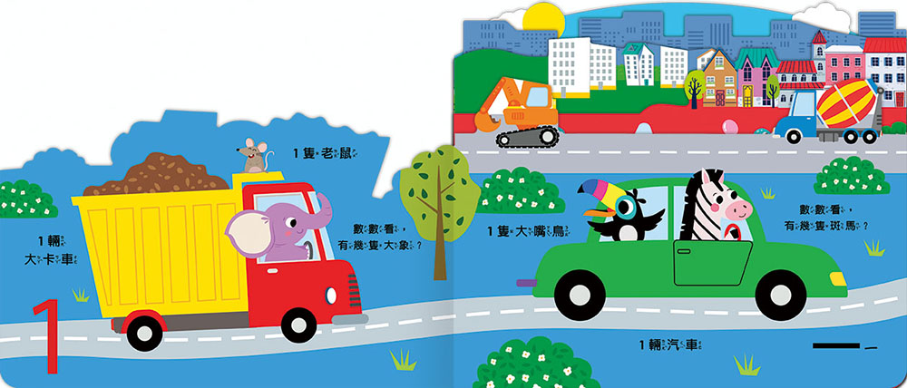 對幼兒來說,玩具與書沒有明確的區別,翻翻書如同玩玩具。因此,有趣的遊戲書扮演了銜接的角色,能成為孩子喜愛閱讀的關鍵。本書讓孩子循序漸進,一步步認識數字、認識馬路上的車子。每一頁色彩鮮明的插圖、書頁上緣立體的城市風貌,吸引孩子的好奇心,引導他們主動探索書中的世界,愛上翻書與閱讀!