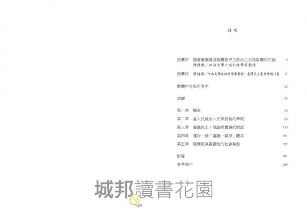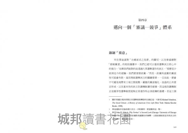 這問題不在於我們當前設計的民主體系失靈。即便當我們目前具主導性的以政黨競爭為基礎的民主模式功能運作良好,我們還是要質疑是否這樣的民主模式就足夠使我們達成對於民主的主要期盼。道爾是當代最具影響力的民主理論家之一,他晚期對此問題則顯得躊躇,他甚至猶豫是否要去稱呼各式各樣的政黨競爭政治體系皆為「民主政體」。因此他認為有必要為這些政治體系創造新術語,即「多元政體」,這樣我們就不會被使用「民主」這個帶有強烈規範性意涵的字眼給愚弄,誤以為我們已經實現了符合本身理想的制度。在道爾的《民主及其批評者們》(Democracy and Its Critics)一書末尾,他提出他稱之為「進階的民主國家的勾勒」(sketches for an advanced democratic country),我在本書中提出的論證亦是本於此精神。只不過道爾的「勾勒」是針對實際上存在著許多「多元政體」所做的另一種系統性解釋說明,最後所提出的簡短建議。而我希望在一項兼顧規範性與經驗性的研究方案,已建立的許多成果的基礎上,將「審議民主」的工作推進得更多。