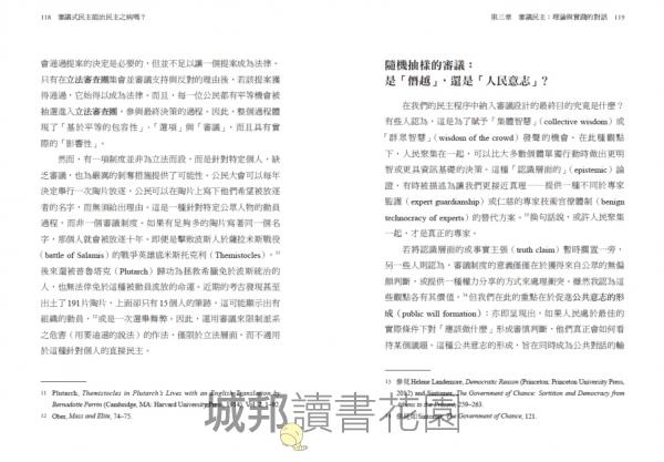 一個有力量且精練的民主願景,其中審議的機制補充了競爭式民主正處於困境中的機制,並支持了審議性的社會。在民主方案似乎拋錨或倒退的時代,這是一本迫切需要、及時出現並且必讀的書。
