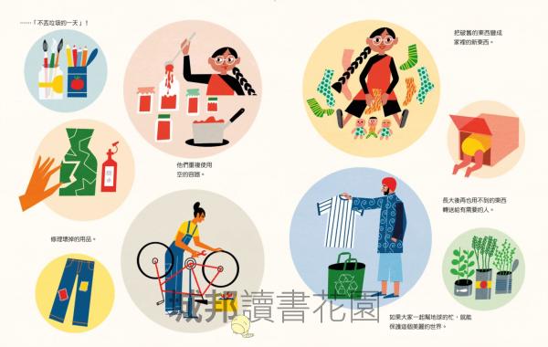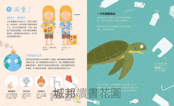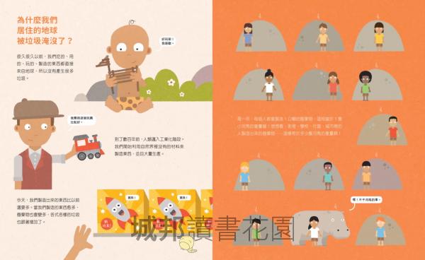 面對氣候變遷全球暖化,環境教育刻不容緩。除了讓孩子了解環境保護的概念與重要性,最重要的是如何在生活中具體實踐。繪本裡以生活中常見的物品與情境,從各式垃圾的分類、如何分解、回收處理,垃圾減量到如何避免資源浪費……用生活化與家庭的角度出發,提供具體可行的建議。