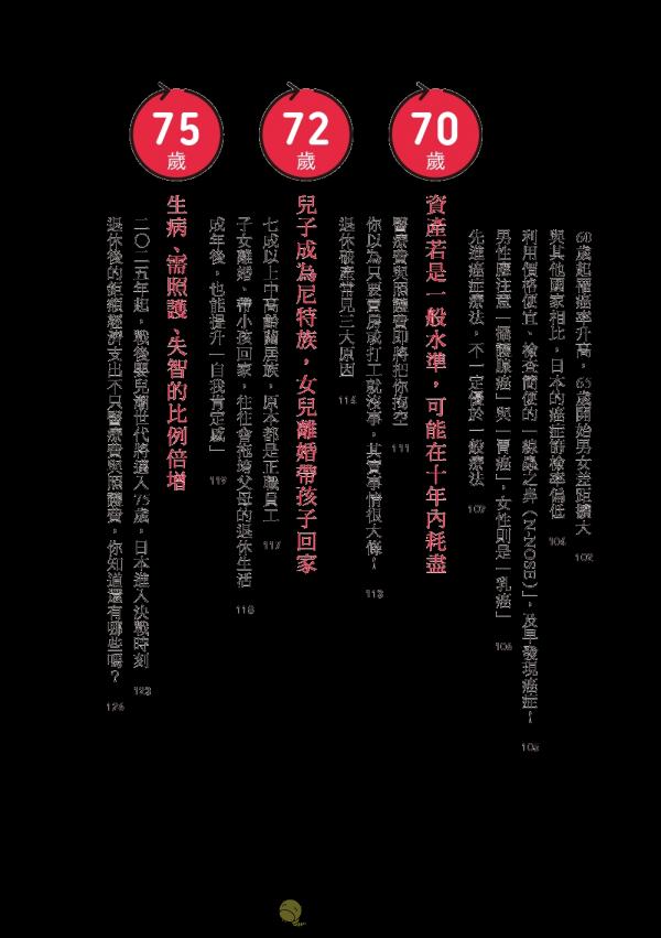 舉例來說,下面這些情況就很有可能發生。這不是我的主觀臆測,而是根據政府、大企業的統計資料、各種研究與文獻,加上我拜訪數百位高齡者後,盡量以客觀且科學的方式歸納出的現實。