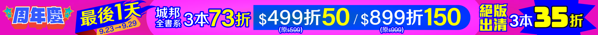 全館1折起,絕版品35折、暢銷新書73折,滿$899立折150,最後機會不容錯過,手刀下單!