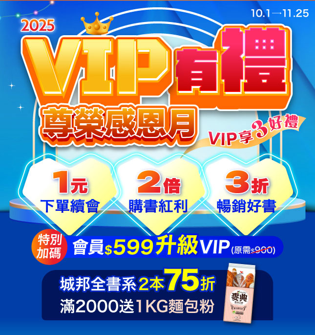 全館$99起,專區一本升級VIP、滿額立贈好禮,年度超值囤書回饋行動開跑!