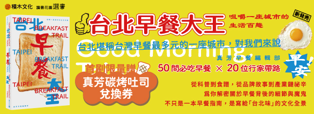 《台北早餐大王》搜羅 50 間台北早餐店,從台式蛋餅到異國早午餐,從清粥小菜到古早味麵包通通有。不只是吃,還帶你追溯百年早餐史:日治時期的米飯小菜、戰後豆漿店的崛起、美軍駐台引起西式風潮,到超商飯糰陪伴上班族的日常——一口咬下,也能嚐見時代的變化……(繼續閱讀)